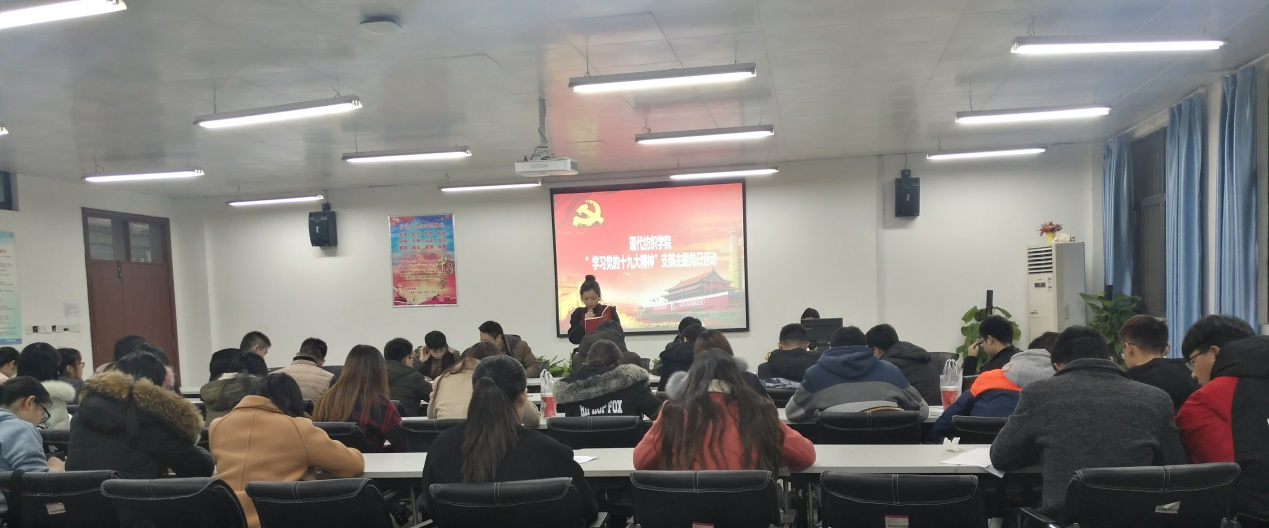 学院学生党支部于12月28日下午3:00在8栋102召开了“学习党的十九大精神”支部主题党日活动。会上奏响了国歌,谢超老师带领我们重温了入党誓词。杨茹同志和王小强同志分别为我们诵读了党章第一章和学习近平新时代中国特色社会主义思想相关内容。
