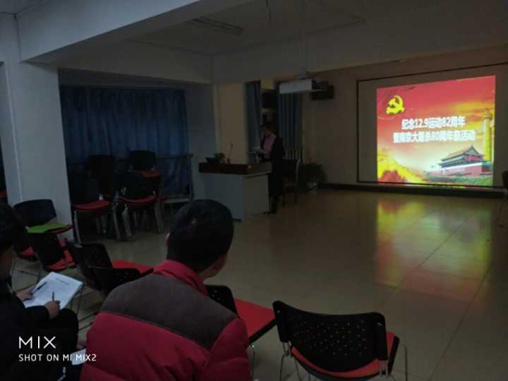 全体党员宣读了入党誓词,杨茹同学发出了青年倡议,王小强、柯弈名等同学进行了发言交流,随后开展了纪念12·9运动82周年暨南京大屠杀80周年祭观影活动。80年过去了,全中华儿女不会忘记,现代史上破天荒的残暴记录,现代文明史上最黑暗的那一页。日军对中国900多座城市和广大乡村进行轰炸,大肆杀戮无辜平民,实施细菌战、化学战,在占领区推行奴化教育,用鸦片毒害中国人民,控制中国的工矿、交通、农业、金融、贸易等经济命脉,掠夺经济资源,给中国人民带来深重灾难。中国人民不会忘记,世界历史不会忘记。