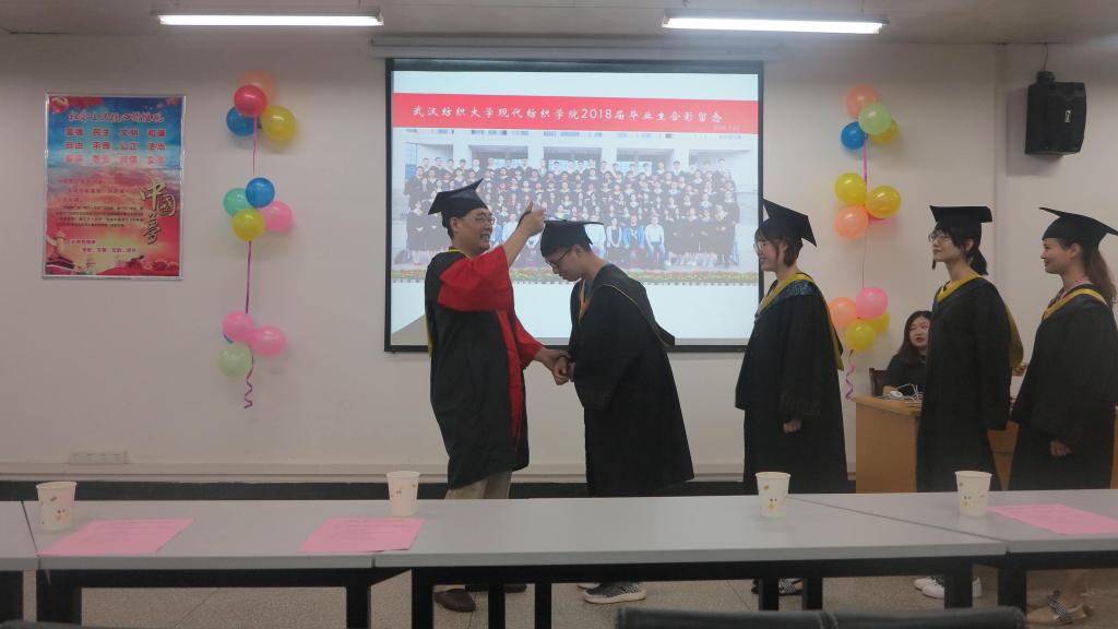 在院歌声中,典礼接近尾声。2018届毕业生代表身穿学士服依次来到台前,由院长李德俊教授为他们拨穗。今昔离别是为了来日更好的重逢,今日,他们从这里启航,也许是进入学业的深造,亦或是迈入社会的浪潮;他日,他们在这里重逢,也许是重拾往日的回忆,亦或是重温热血的青春,都是烙印在骨髓之上的纺大之心在呼唤着游子的归家信号。
