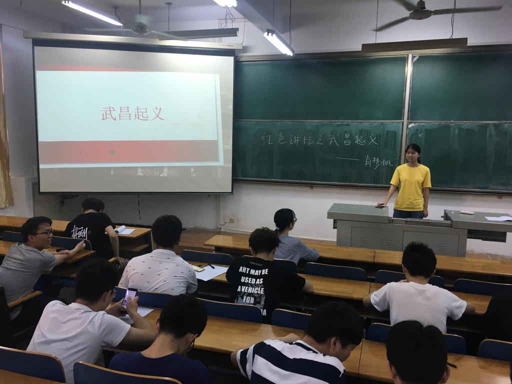 2018年5月27日,学院学生党支部学生党员肖梦帆同学在3栋教学楼217教室给轻化31501班同学开展了以“学习武昌起义”为主题的第31次党员红色讲坛活动。